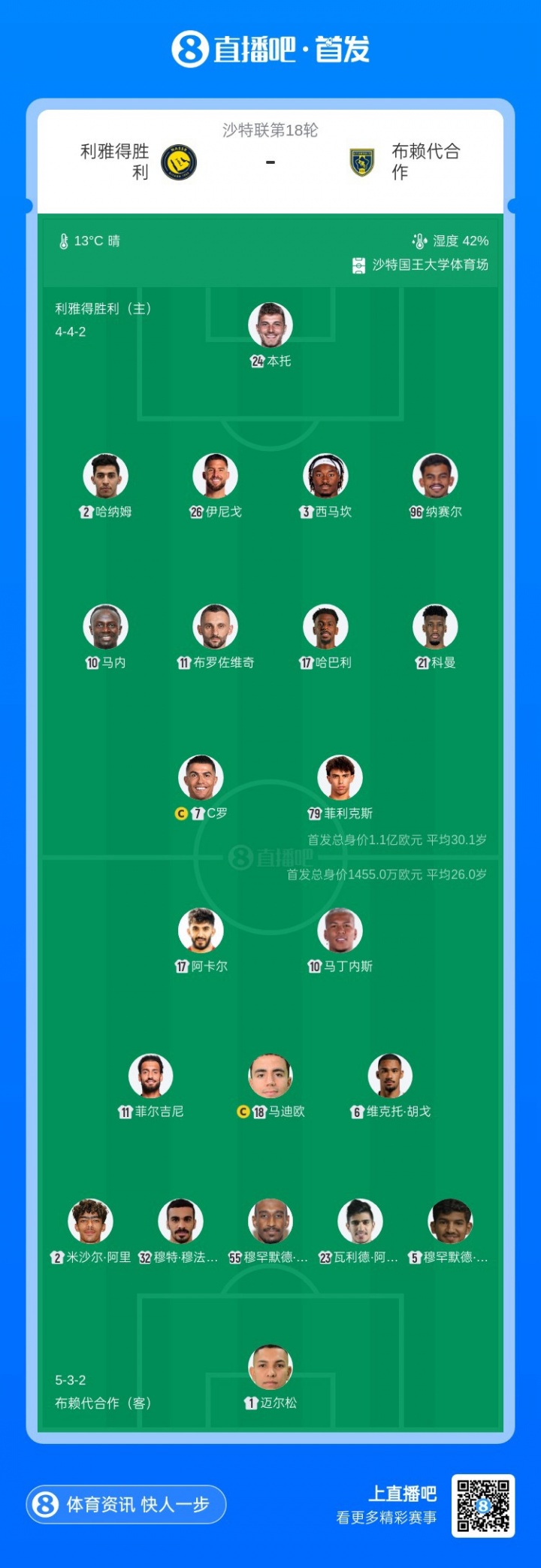 1月27日讯 沙特联第18轮,利雅得胜利vs布赖代合作比赛即将打响。赛前首发出炉。